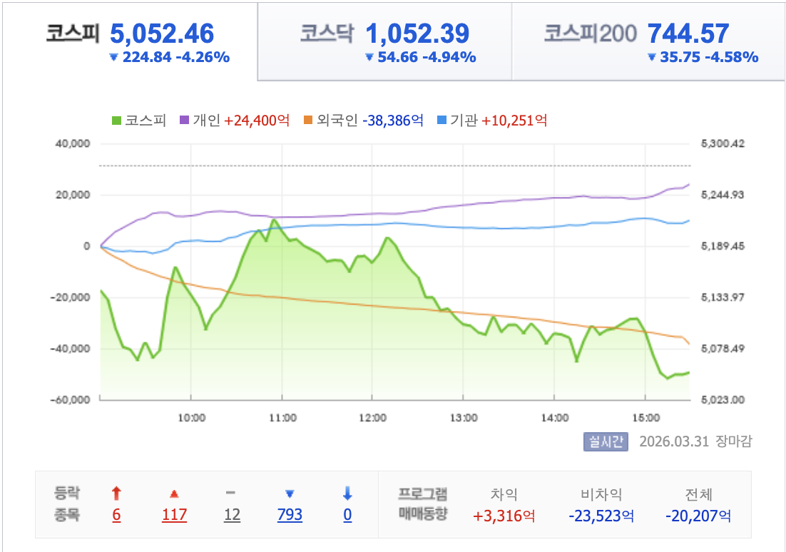 2026년 3월 31일 · 국내증시 마감 브리핑 외국인 투매·환율 1530원 돌파 코스피 5050선까지 밀린 하루 중동발 지정학 리스크, 국제유가 급등, 원·달러 환율 급등, 외국인 대규모 매도가 한꺼번에 겹치며 국내 증시가 다시 크게 흔들렸습니다. 오늘 장은 단순한 하락이 아니라, 3월 내내 누적된 불안이 월말에 다시 한 번 폭발한 장세로 보는 편이 맞습니다. KOSPI 5,052.46 -4.26% KOSDAQ 1,052.39 -4.94% 원·달러..