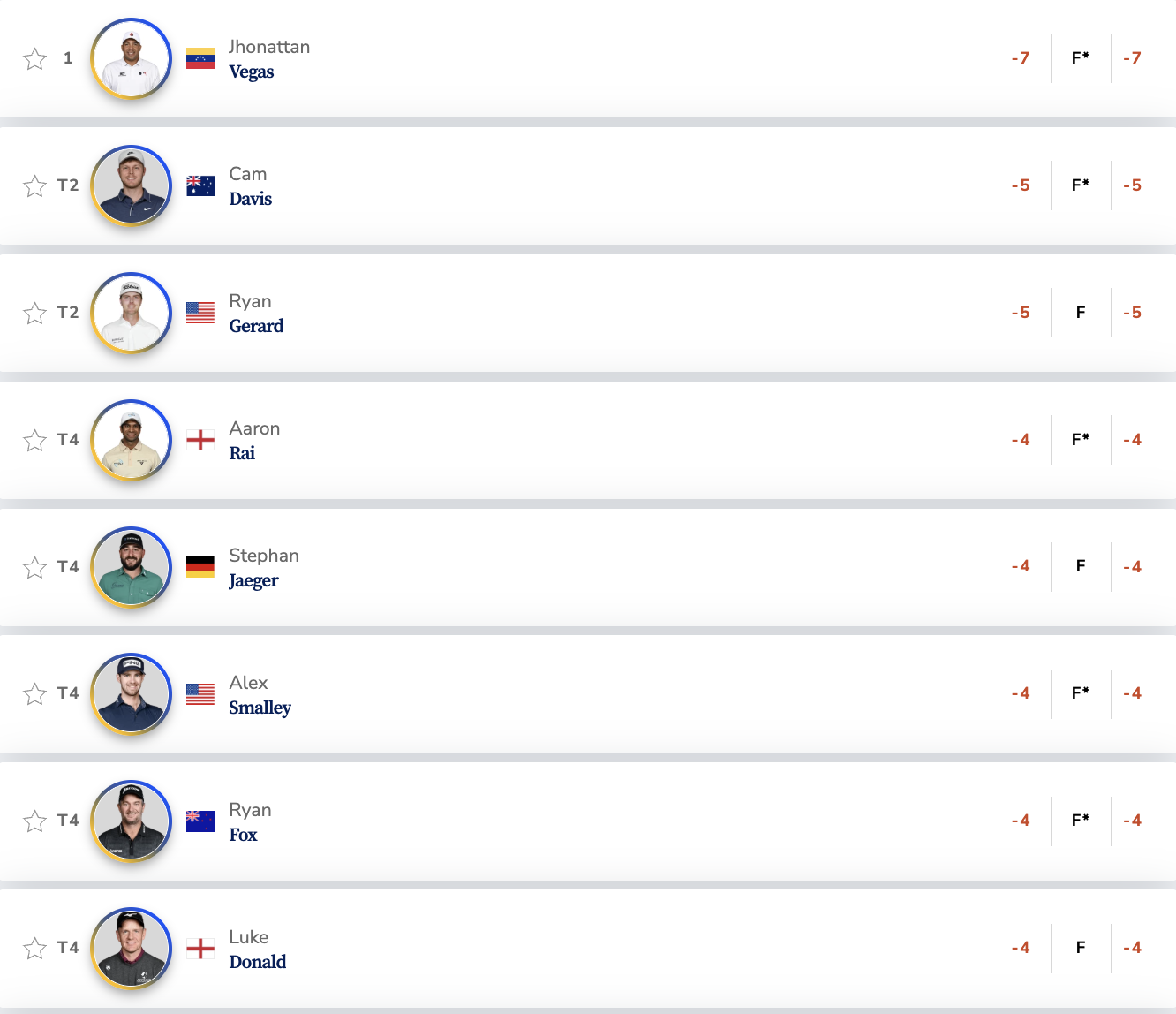 대회가 열리는 노스캐롤라이나주 출신인 신인 라이언 제러드(미국)와 캠 데이비스(호주)가 5언더파 66타로 공동 2위에 올랐으며, 올해 열리는 라이더컵 유럽팀 단장 루크 도널드(잉글랜드)가 4언더파 67타로 공동 4위, 미국팀 단장 키건 브래들리가 3언더파 68타로 공동 9위에 이름을 올렸습니다.