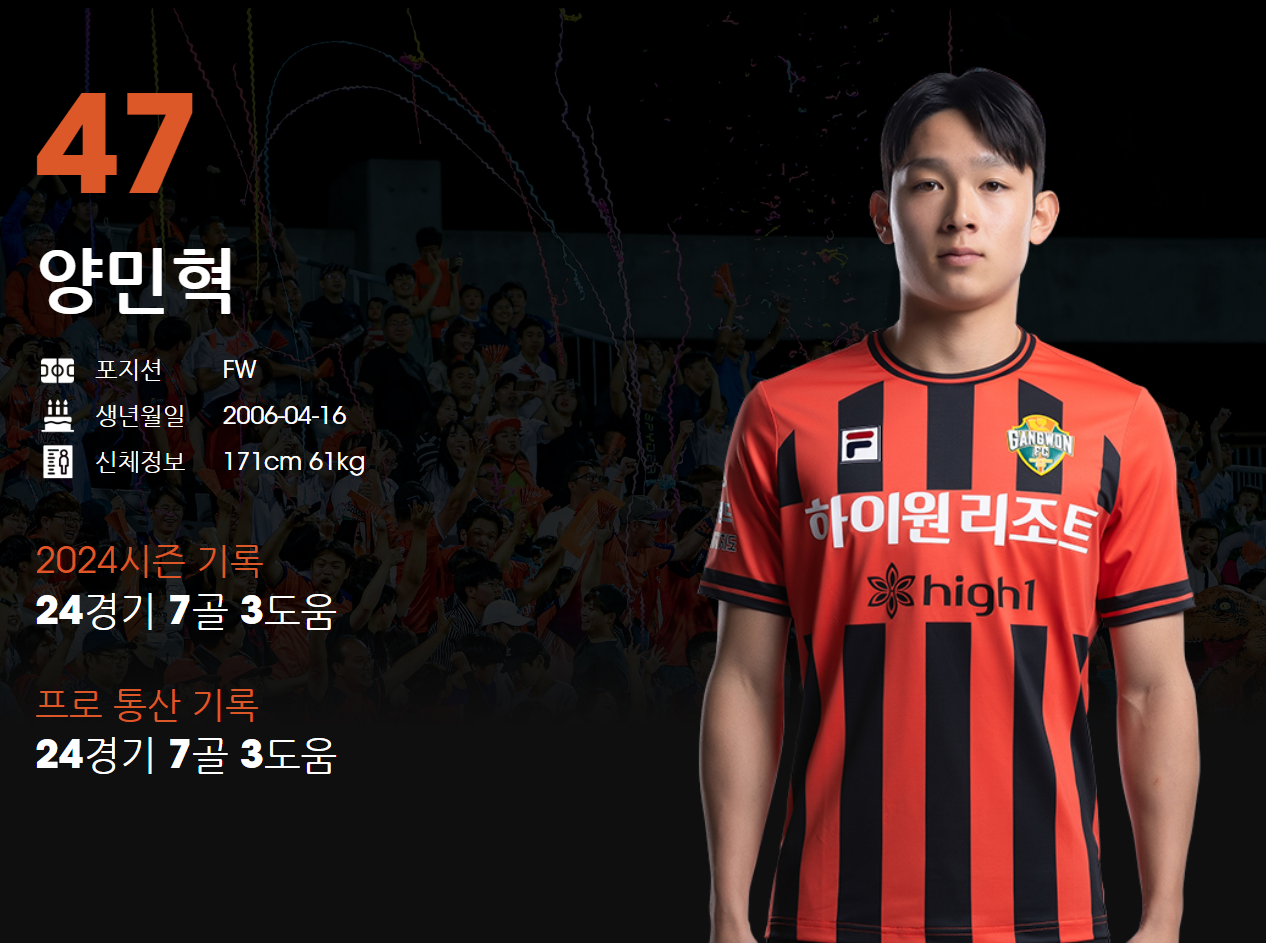 ▶ 2006년생 양민혁은 현재 강원 산하 강릉제일고 3학년으로 지난해 연말 준프로 계약을 체결하였습니다.
