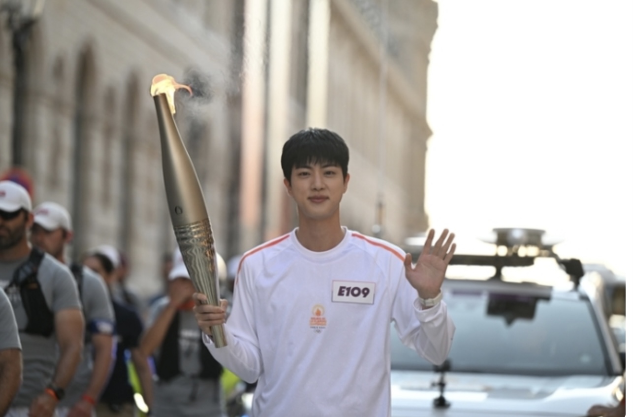 지난 15일 파리 루브르 박물관 구간에서 이뤄진 성화 봉송 주자로 참여한 진은 약 200m를 행진하면서 올림픽의 성공적인 개최에 힘을 보탰습니다.