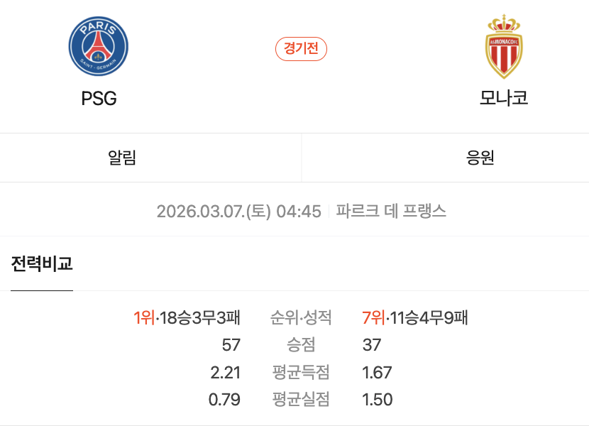 3/7(토) 04:45 리그1 PSG vs AS 모나코 이강인 로테이션 변수(라인업 확인)