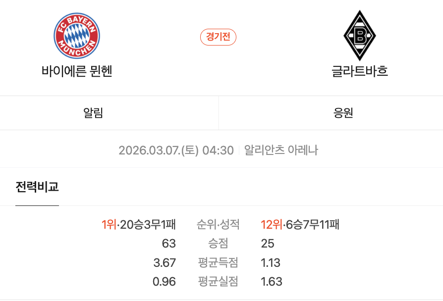 • 관전 팁: 전반에 바이에른이 라인을 올릴 때, 글라트바흐의 첫 역습 한두 번에서 수비 뒷공간 대응이 승부를 가르는 경우가 많습니다.
