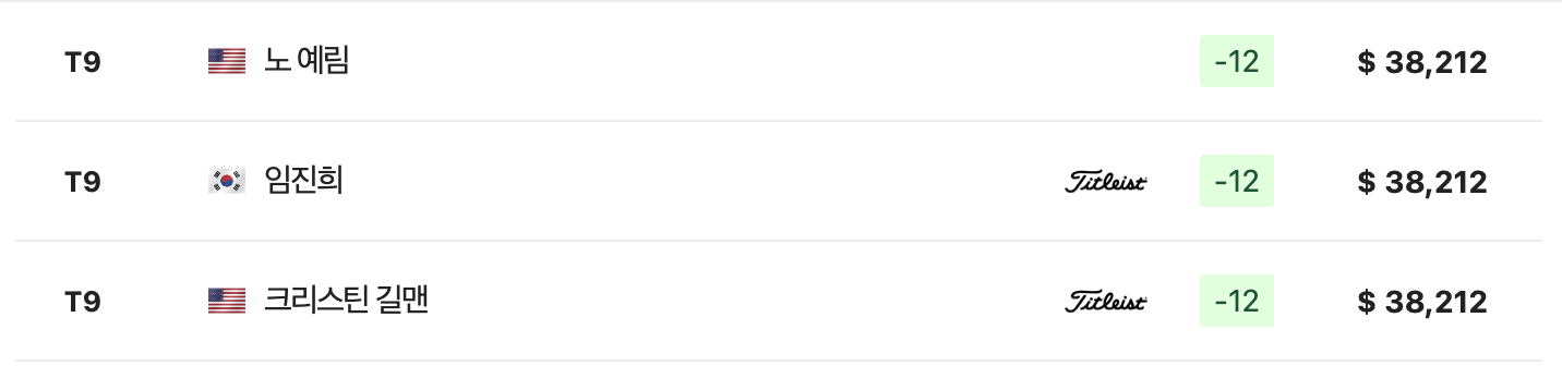 임진희(25.안강건설)와 김아림(28.한화큐셀)은 노예림(미국) 등과 함께 최종합계 12언더파 276타로 공동 9위를 차지하였으며, 대회 2연패에 나선 이민지(호주)는 최종합계 9언더파 279타로 공동 27위로 대회를 마쳤습니다.