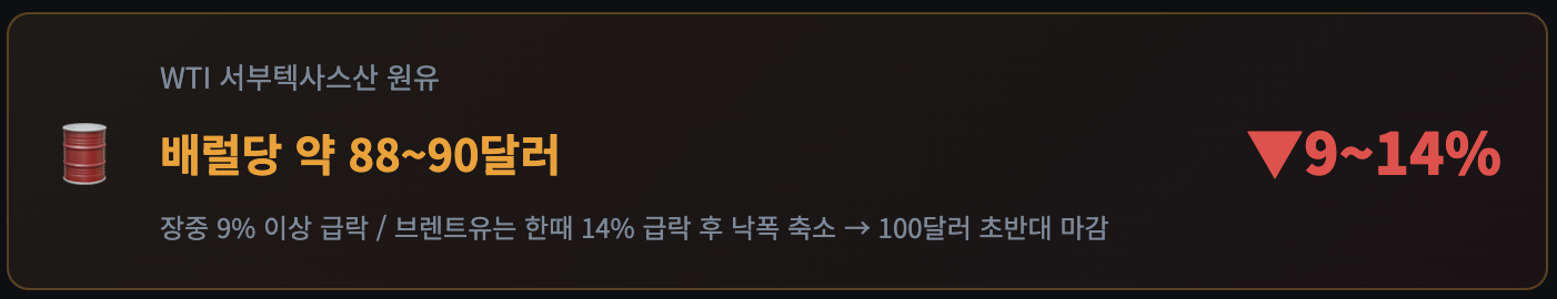 - 국제유가 급락 - WTI 9% 하락, 브렌트유 장중 최대 14% 하락(낙폭 일부 축소), 이란이 대화 자체를 부인해 불확실성은 여전히 잔존
