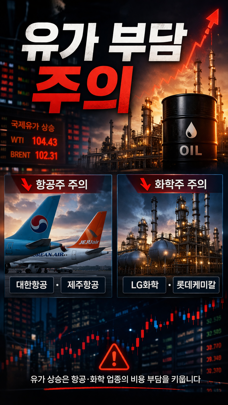 국제유가가 다시 브렌트유 102달러대, WTI 104달러대로 올라서면서 오늘 시장은 업종별로 반응이 갈릴 가능성이 높습니다. 정유·에너지와 방산은 상대적으로 주목받을 수 있지만, 항공과 화학은 비용 부담 우려가 커질 수 있습니다. 그래서 오늘 장은 단순 지수보다도 어느 업종으로 돈이 도는지를 먼저 봐야 하는 장입니다.
