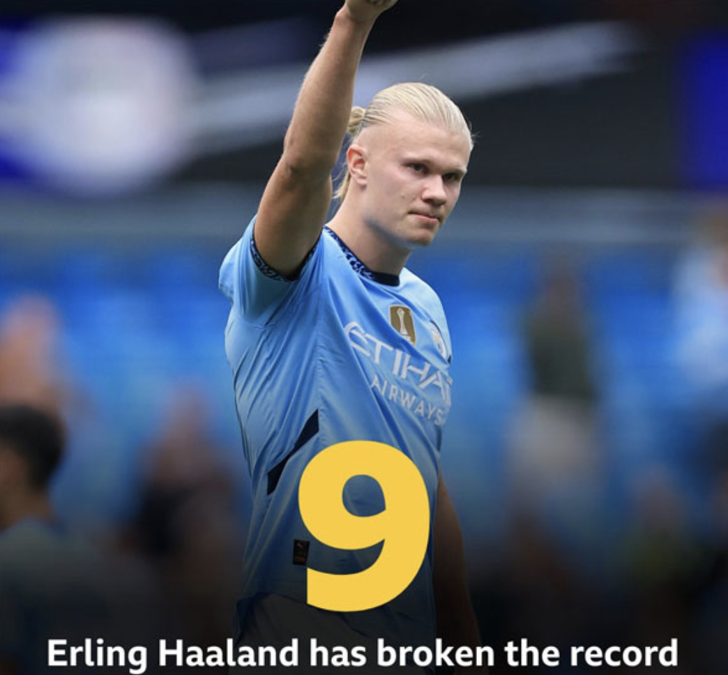 노르웨이 출신 홀란은 새 시즌 개막후 4경기에서 9골을 기록하며 맨유 전설인 웨인 루니가 보유한 초반 4경기 8골이라는 기록을 13년만에 넘어섰습니다.
